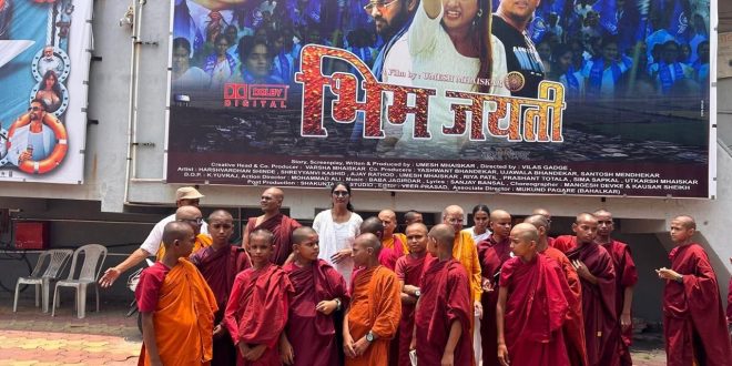 वर्धा :- भीम जयंती चित्रपटाला आज तब्बल 13 दिवस पूर्ण झालेली आहे या चित्रपटाचा उत्स्फूर्त प्रतिसाद बघून बौद्ध धम्म गुरु यांनी हा चित्रपट बघण्याचे आज दिनांक 11 जून 2025 ला गणेश टॉकीज वर्धा येथे सकाळी 12 ते 3 हा शो बघण्याचे ठरविले आहे व या शो करीता भंतेजींची भारी संख्या उपस्थित असून या चित्रपटाविषयी त्यांनी आपले मनोगत व्यक्त करताना सांगितले आहे की, भीम जयंती चित्रपट हा डॉक्टर बाबासाहेब आंबेडकरांच्या विचारावर आधारित असून समाजात होणाऱ्या समस्येवर यात प्रामुख्याने प्रकाश टाकण्यात आलेला आहे.
