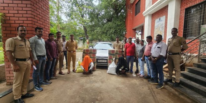 चंद्रपूर :- दिनांक २६ जून २०२५ रोजी पोलीस स्टेशन बल्लारपूर हद्दीत हद्दीमध्ये पेट्रोलिंग करत असताना गोपनीय माहिती मिळाली की, चंद्रपूर ते बामणी-बल्लारपूर रोडवरून एका चारचाकी वाहनाने अवैधरित्या दारूची वाहतूक होणार आहे. या वरून बल्लारपूर पोलीसांनी नगर परिषद चौक, बल्लारपूर येथे पंच व स्टाफसह नाकाबंदी करून साधारणतः सायंकाळी ५.२५ वाजता, सिल्वर रंगाची Hyundai i20 कार (MH 34 AM 9673) थांबवून पाहणी केली असता सदर वाहनात सुनील महादेव मेश्राम रा. शिवाजी वार्ड बल्लारपुर व श्रीनिवास चंद्रया भीमगणी रा. बाबपेठ चंद्रपूर ही व्यक्ती मिळुन आली. त्यांचे समवेत पंचा समक्ष वाहनाची झडती घेतली तेंव्हा सदर वाहनात (१) २० नग खरडयाचे खोक्यात रॉकेट संत्रा कंपनिच्या ९० एम.एल देशी दारु ३५ रु. प्रमाणे -७०,०००/-रु.,