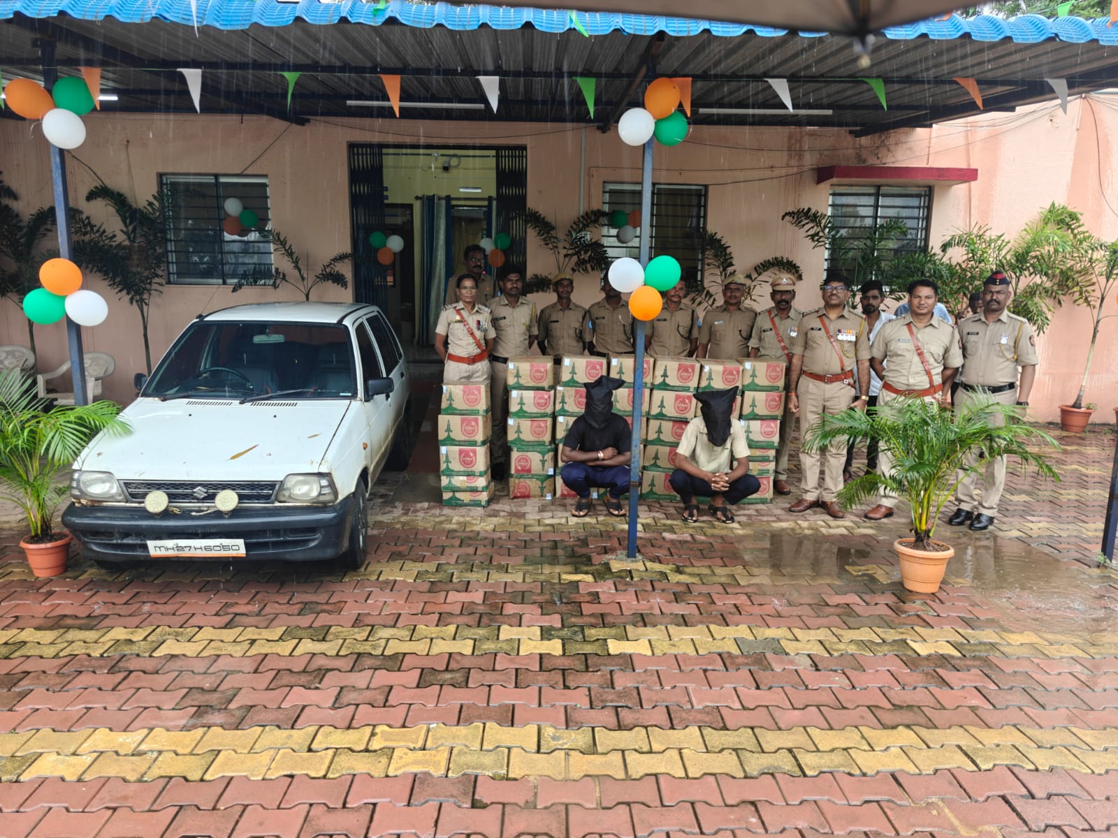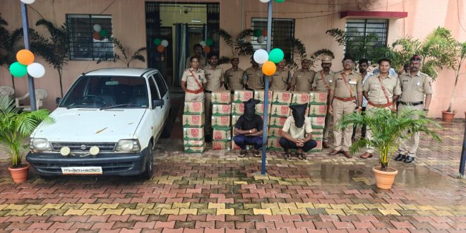 चंद्रपूर :- आज दिनांक १४/०८/२०२५ रोजी रात्रीला गोपनिय बातमीदारांकडून मिळालेल्या खात्रीशिर माहिती वरुन मुल पोलीसांनी काटवण टी-पॉईन्ट मुल ते मारोडा रोडवर नाकाबंदी करुन सापळा रचुन मारोती कार वाहन क्रमांक MH27-H-6050 येताच वाहन थांबवून वाहनाची झडती घेतली असता वाहनामध्ये २४ खडर्याचे पेटी ज्यात रॉकेट देशी दारु (१०० नग) ९० एम.एल.च्या किं. १,३६,०००/- रु. चा माल मिळुन आल्याने सदर अवैध देशी दारु आणि दारु वाहतुकी साठी वापरेला वाहन असा एकुण २,११,०००/- रुपयाचा माल जप्त करण्यात आला असुन आरोपी नामे शंकनाथ दिलीप टिंगुसले, वय २५ वर्ष आणि अमन अनिल टिंगुसले वय २२ वर्ष दोन्ही रा. वार्ड क्र.८ मुल यांना अटक करुन त्यांचे विरुध्द पोलीस स्टेशन मुल येथे अपराध क्रमांक ३२४/२०२५ कलम ६५ (अ), ८३ महाराष्ट्र दारुबंदी कायदान्वये गुन्हा दाखल करण्यात आला आहे. सदर गुन्हयाचा पुढील तपास मुल पोलीस करीत आहे.