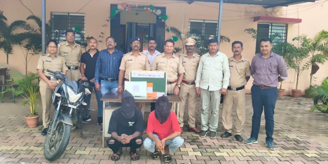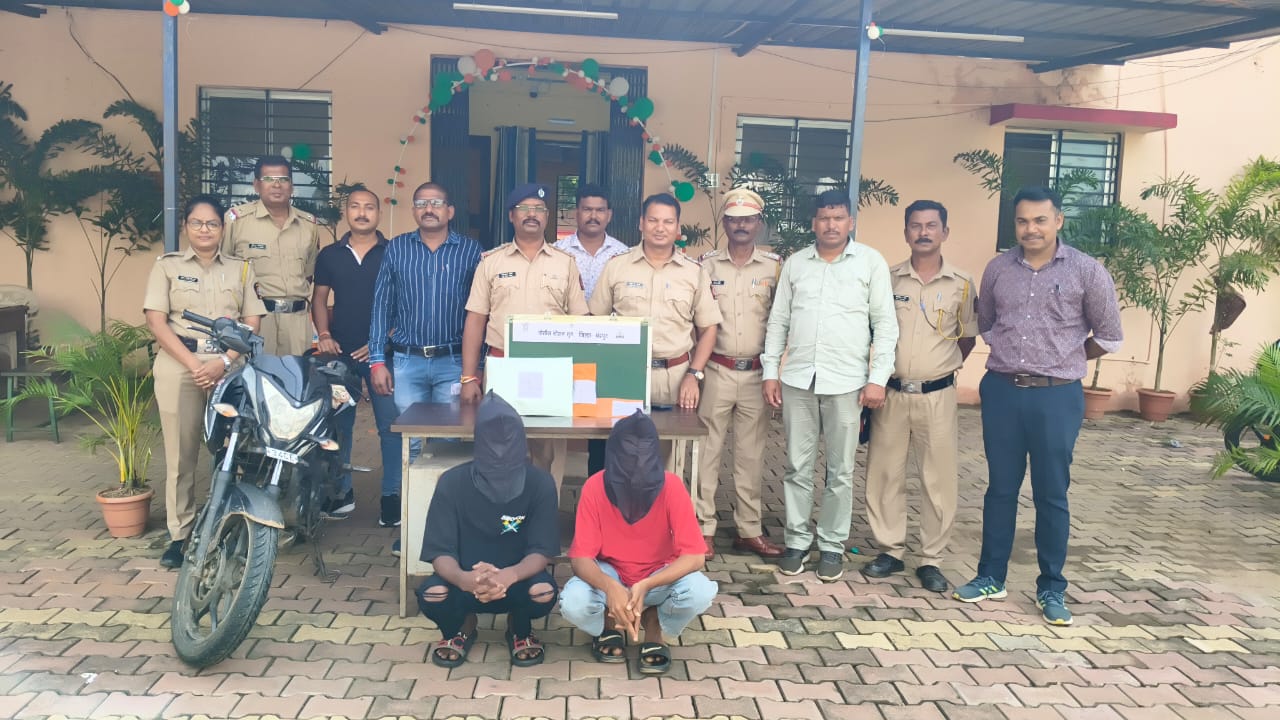 चंद्रपूर :- दिनांक २१ ऑगस्ट, २०२५ रोजी सायंकाळी मिळालेल्या गोपनिय माहितीवरुन जुना सोमनाथ मंदीर परिसर, मुल रेल्वे स्टेशन, मुल येथे एका मोटार सायकलवरील दोन युवकांना ताब्यात घेवुन त्यांची पंचासमक्ष झडती घेतली असता त्यांच्या ताब्यातील मोटार सायकल बजाज पल्सर क्रमांक MH34-CE-6620 च्या मागील सिटच्या खाली विक्री करण्याचे उद्देशाने अमली पदार्थ सुकलेला गांजा वनस्पती १७९ ग्रॅम किंमत ३५८०/- रु.चा अमली पदार्थ अवैध रित्या मिळुन आल्याने आरोपी (१) रोहीत प्रेमलाल कोवे वय २० वर्ष, (२) आदित्य उर्फ बुलेट उमाजी मडावी वय १९ वर्ष दोन्ही रा. येरगांव ता. मुल यांचेविरुध्द पोलीस स्टेशन मुल येथे अपराध क्रमांक ३४०/२०२५ कलम ८ (सी), २० (बी), २९ एन.डी.पी.एस. अॅक्ट अन्वये गुन्हा नोंदविण्यात आला असुन त्यांचे ताब्यात मिळुन आलेला गांजा, नगदी ५०० व मोटार सायकल असा एकुण १,०४,८०/- रुपयाचा माल जप्त करण्यात आला असुन पुढील तपास मुल पोलीस करीत आहे.