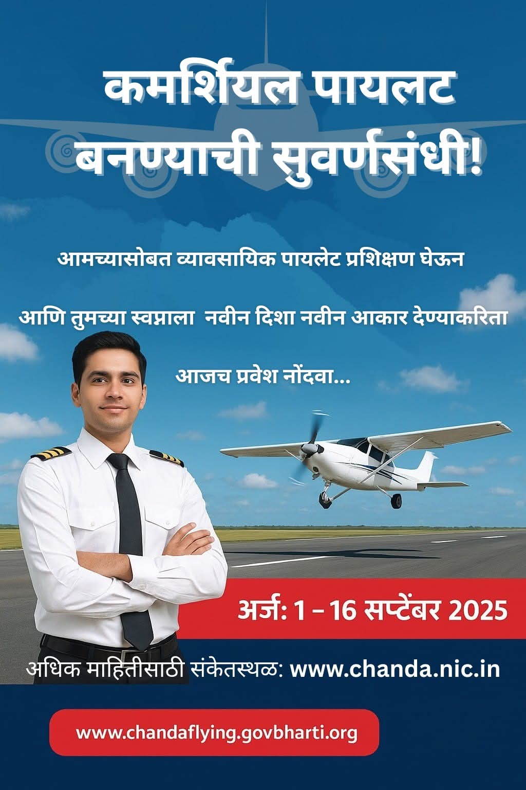 चंद्रपूर :- नागपुर फ्लाईंग क्लब अंतर्गत चंदपुर फ्लाइंग स्टेशन समितीच्या वतीने चंद्रपुर जिल्ह्यातील 12 वी उतीर्ण (गणित, भौतिकशास्त्र व रसायनशास्त्र या विषयासह उत्तीर्ण) झालेल्या 2 विद्यार्थ्यांना व्यावसायिक पायलट लायसन्स प्रशिक्षणाकरीता विहित नमुन्यातील अर्ज मागविण्यात येत आहे. सदर प्रशिक्षणाकरीता निवड झालेल्या प्रशिक्षणार्थी करीता राज्य शासनाकडून 90 टक्के अनुदान (अदांजे 37 लक्ष) रुपये प्राप्त होणार असून उर्वरित 10 टक्के रक्कम (अंदाजे 4 लक्ष रुपये) निवड झालेल्या विद्यार्थ्यांनी स्वतः भरावयाची आहे. याबाबतचा अधिक तपशील व अर्जाचा नमुना www.chanda.nic.in या संकेतस्थळावर उपलब्ध आहे.