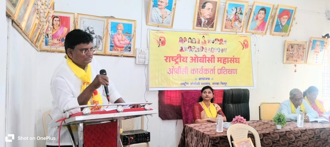 चंद्रपूर :- राष्ट्रीय ओबीसी महासंघ की राष्ट्रीय कार्यकारिणी ने प्रत्येक तालुका में कार्यकर्ता प्रशिक्षण आयोजित करने का निर्णय लिया है और इस अभियान का पहला ओबीसी कार्यकर्ता प्रशिक्षण चिमूर में सफलतापूर्वक आयोजित किया गया। यह प्रशिक्षण राष्ट्रीय ओबीसी महासंघ, चिमूर तालुका द्वारा राष्ट्रसंत तुकड़ोजी पाट संस्था हॉल में आयोजित किया गया.महाराष्ट्र में इस समय विभिन्न रैलियाँ और विरोध प्रदर्शन चल रहे हैं। कुछ राजनीतिक नेता चुनावों को देखते हुए लोगों में भ्रम पैदा करने की कोशिश कर रहे हैं। 2 सितंबर, 2025 के सरकारी निर्णय के संबंध में, राष्ट्रीय ओबीसी महासंघ के राष्ट्रीय अध्यक्ष डॉ. बबनराव तायवाड़े और राष्ट्रीय महासचिव सचिन राजुरकर ने मीडिया के माध्यम से एक विद्वत्तापूर्ण और तर्कसंगत दृष्टिकोण प्रस्तुत किया.