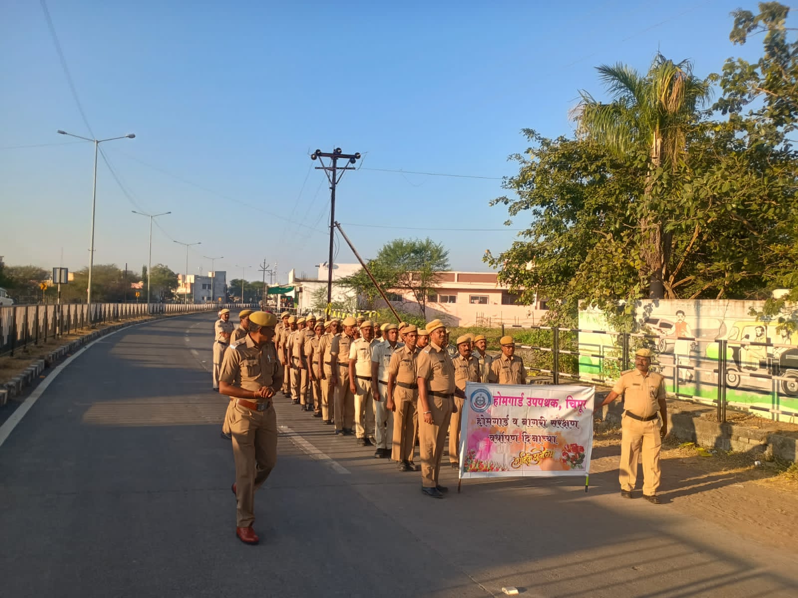 चिमूर :- होमगार्ड पथकाचे जवान हे पोलिस विभागाचे खांद्याला खांदा लावुन निष्काम सेवा देत आहेत.समाजात शांतता व सुव्यवस्था कायम ठेवण्याच्या महान कार्यात होमगार्डचे योगदान महत्वपुर्ण आहे. त्यांचा सेवेचा यथायोग्य सन्मान होणे आवश्यक असल्याचे मत ठानेदार दिनेश लबडे यांनी व्यक्त केला. होमगार्ड पथकाच्या वर्धापनदिना निमीत्य प्रमुख पाहुने म्हणुन बोलत होते.महाराष्ट्र राज्य नागरीक संरक्षण दल तथा होमगार्ड संघटनेच्या 71 व्या वर्धापनदिना निमीत्य चिमुर पोलिस स्टेशनच्या परिसरात रूट मार्च आणि स्वच्छता अभियानाचे आयोजन करण्यात आले होते.