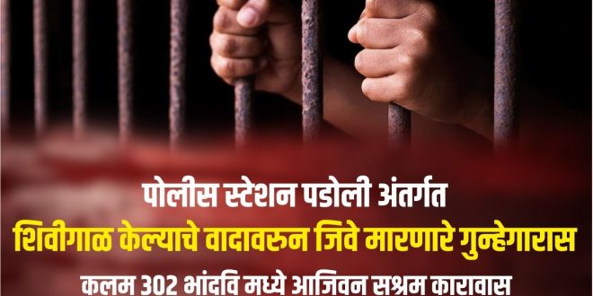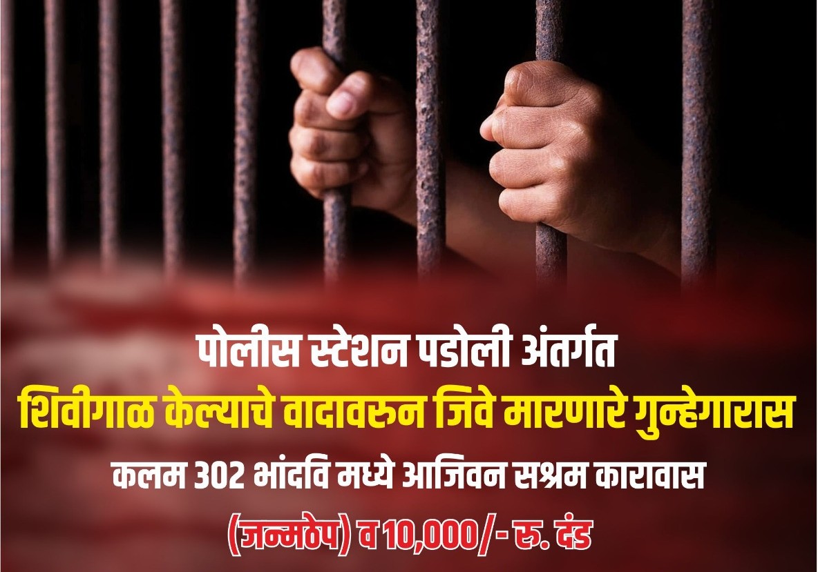 चंद्रपूर :- दिनांक ९ जानेवारी २०१९ रोजी पोलीस स्टेशन पडोली हद्दीतील मौजा साखरवाही येथील आशुतोष दिलीप शेरकी वय २१ वर्ष याने तक्रार दिली की, त्याच्या घराशेजारी वैभव पुंडलिक शेरकी वय ३५ वर्ष याने मृतक दिलीप बाबुराव शेरकी वय ५१ वर्ष यास शिवीगाळ केल्याचे कारणावरुन झगडा-भांडण करुन बांबुचे काठीने डोक्यावर, हातावर, छातीवर जबर मारहाण गंभीर जखमी करुन जिवानिशी ठार केले यावरुन पोस्टे पडोली येथे अप.क्र.९/२०१९ कलम ३०२, ३२४ भादंविचा गुन्हा नोंदविण्यात येवुन गुन्हयाचा सखोल तपास पोस्टे पडोली येथील तत्कालीन पोउपनि नागेश जायले यांनी करुन तपासाअंती भक्कम पुराव्याचे आधारे आरोपीविरुध्द मा. न्यायालयात दोषारोपपत्र सादर केले.