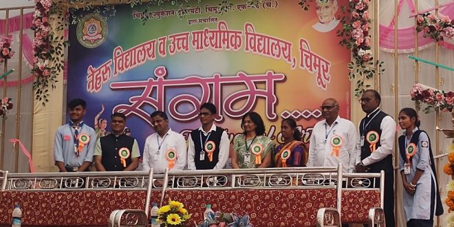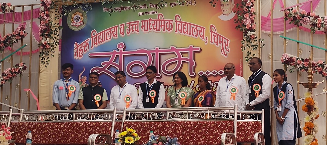 चंद्रपूर/चिमूर :- नेहरू विद्यालय व उच्च महाविद्यालय, चिमूर येथे संगम २०२५–२०२६ या नावाने आयोजित वार्षिक स्नेहसंमेलन कार्यक्रम आज दिनांक ३१ डिसेंबर २०२५ रोजी शाळेच्या भव्य पटांगणात अत्यंत उत्साहात व आनंदी वातावरणात पार पडला.या कार्यक्रमाच्या अध्यक्षस्थानी निशिकांत मेहरकुरे हे होते. तर प्रमुख पाहुणे म्हणून सतिश मेश्राम यांनी कार्यक्रमाची शोभा वाढवली.कार्यक्रमाचे प्रभावी व सूत्रबद्ध संचालन विलास गोमासे यांनी केले.स्नेहसंमेलनाच्या निमित्ताने विद्यार्थ्यांनी विविध सांस्कृतिक कार्यक्रम,नृत्य,़गीत,नाट्यप्रयोग आदींचे सादरीकरण करून उपस्थितांची मने जिंकली.विद्यार्थ्यांच्या कलागुणांना व व्यासपीठावरील आत्मविश्वासाला उपस्थितांनी भरभरून दाद दिली.