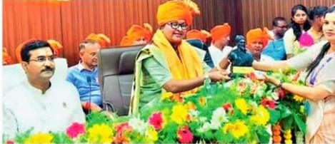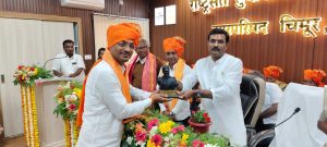चिमूर :- चिमूर नगर परिषदेच्या राष्ट्रसंत तुकडोजी महाराज सभागृहात नवनियुक्त नगराध्यक्ष तथा नगरसेवकांचा पदग्रहण सोहळा नुकताच संपन झाला. नगर परिषदेच्या मुख्याधिकारी अर्चना वंजारी यांनी नवनियुक्त नगराध्यक्षांना नगराध्यक्षपदाच्या खुर्चीवर गीता लिंगायत यांना विराजमान केले.यावेळेस मंचावर आमदार कीर्तीकुमार भांगडीया नवनियुक्त नगराध्यक्षा गिता लिंगायत,माजी राज्यमंत्री रमेशकुमार गजभे, नव नियुक्त उपाध्यक्ष संजय नवघडे, मुख्याधिकारी अर्चना वंजारी,डॉ दिपक यावले, निलम राचलवार ,डॉ.नरेंद्र यावले, डॉ.दिलिप शिवरकर, गजानण गुडधे सर्व नवनिर्वाचित नगरसेवक इत्यादीसह मान्यवर उपस्थित होते.