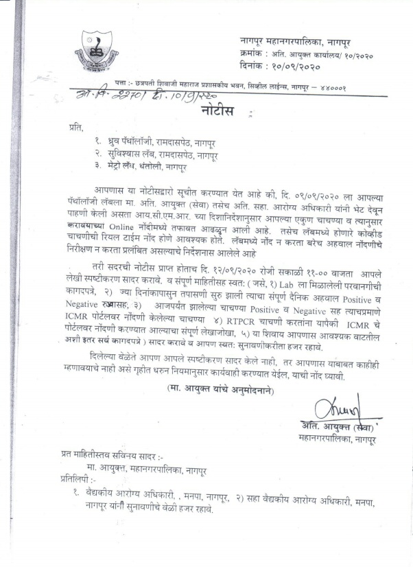 मनपाचे अतिरिक्त आयुक्त जलज शर्मा यांच्या नेतृत्वात पथकाने ९ सप्टेंबर रोजी मनपाद्वारे कोव्हिड चाचणीची परवानगी देण्यात आलेल्या पॅथॉलॉजीची पाहणी केली. यामध्ये रामदासपेठ येथील धृव पॅथॉलॉजी, सुविश्वास लॅब आणि धंतोली येथील मेट्रो लॅबमध्ये आय.सी.एम.आर.च्या दिशानिर्देशानुसार एकूण चाचण्या व त्यानुसार करावयाच्या ऑनलाईन नोंदीमध्ये तफावत आढळून आली. यासोबतच लॅबमध्ये होणा-या कोव्हिड चाचणीची रियल टाईम नोंद होणे आवश्यक असताना लॅबमध्ये नोंद न करता अहवाल नोंदणीचे निरीक्षण न करता प्रलंबित ठेवल्याचे पथकाला निर्देशनास आले, यासंदर्भात मनपा आयुक्तांच्या निर्देशानुसार नोटिस बजावण्यात आले.