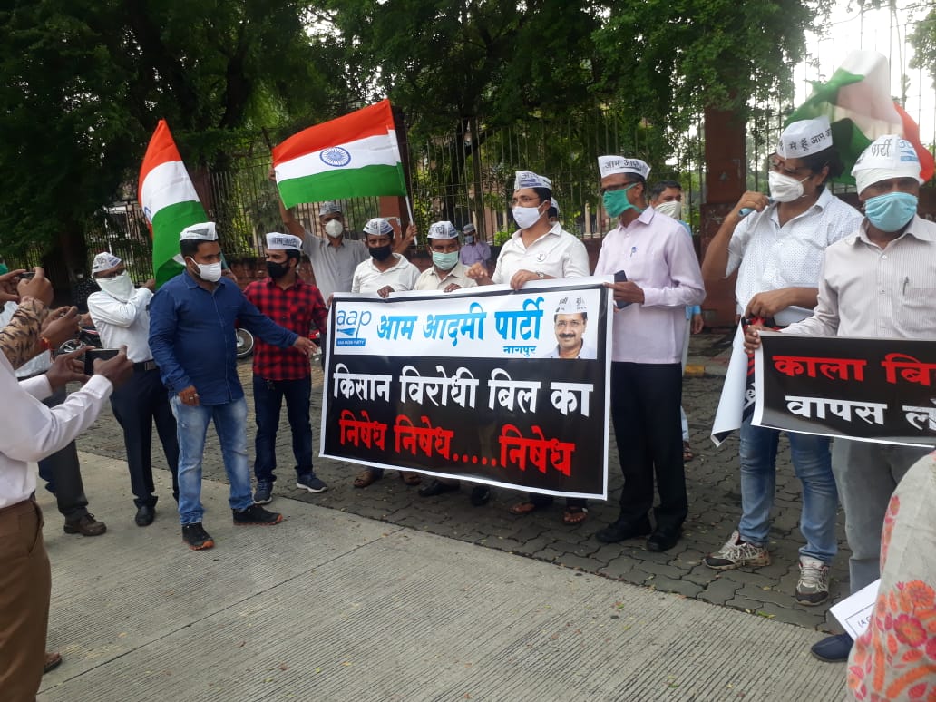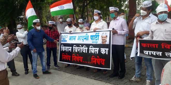 नागपुर :- आम आदमी पार्टी ने आरोप केले की, देशभरातील शेतकरी व संसदेतले विरोधी पक्षांचा आवाज दाबत काही मोजक्या उद्योगपतींच्या दबावाखाली येऊन केंद्र सरकारने लोकसभा व राज्यसभेमध्ये तीन शेती विरोधी बिले पारित केली. विशेषतः राज्यसभेत त्यांचे बहुमत नसताना देखील आवाजी मतदानाच्या जोरावर असंविधानिकरित्या ही बिले पारित करण्यात आली. या कायद्यांमुळे देशभरातील शेतकऱ्यांच्या मनात रोष आहे. केंद्र सरकारने आणलेल्या या कायद्यांविरोधात आम आदमी पार्टीने देशभरात निदर्शने केली.