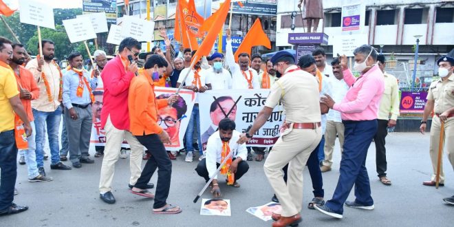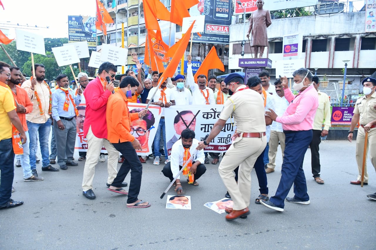नागपुर :- आज पूर्व नागपूर शिवसेना ने महाराष्ट्र के मुख्यमंत्री श्री उद्धव ठाकरे के प्रती की गई नारायण राणे द्वारा अभद्र टिप्पणी के विरोध में सेंट्रल एवेन्यु के टेलीफोन एक्सचेंज चौक पर नारायण राणे का प्रतीकात्मक पुतला बनाकर उसे जूते चप्पल की माला पहनाई, ओर नारे लगाएं गए। विरोध प्रदर्शन का नेतृत्व शिवसेना उपजिल्हा प्रमुख यशवंत गुड्डु रहांगडाले ने किया।