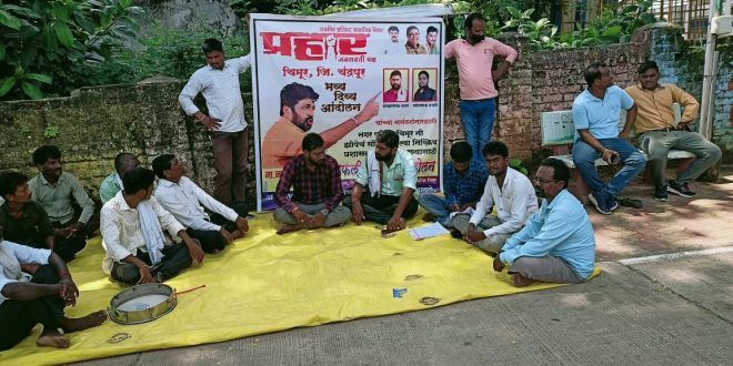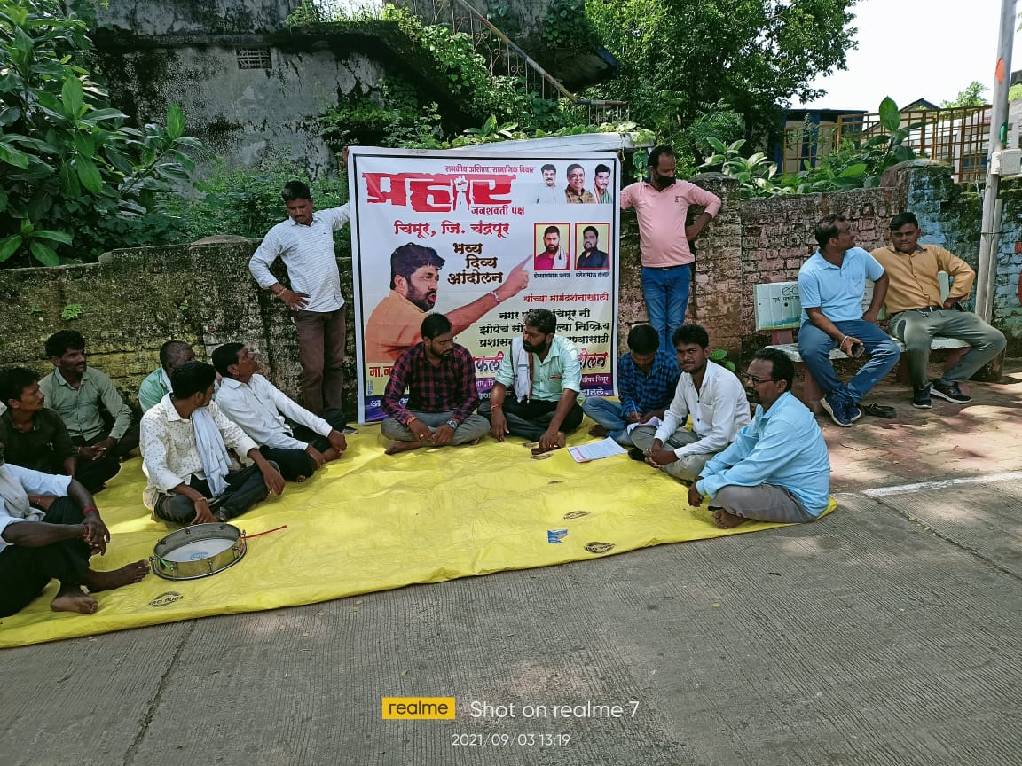 चिमूर :- नगर परिषद प्रभाग क्र, १७ मौजा काग येथील संपुर्ण नाल्या व साफसफाई व सोयी – सुविधा ऊपलब्ध करुन देण्यासाठी चार ते पाच महिन्यापासून मौजा काग वासी नागरीकांनी याबाबत चिमूर नगर परिषदला तोंडी तक्रार केली त्यानंतर प्रहार जनशक्ती पक्षाच्या वतीने वांरवार निवेदन दिले त्या दिवेदनाद्वारे प्रहार स्टाईलने आंदोलनाचा ईशारा सुद्धा देण्यात आला होता मात्र चिमूर नगर परिषदनी त्या निवेदनाची कुठल्याही प्रकारची दखल घेतली नाही आज दि, 3-9-2121रोज शुक्रवारला या चिमूर नगर परिषदेने झोपेचे सोंग घेतलेल्या निष्क्रीय प्रशासनाला जागे करण्यासाठी प्रहार जनशक्ती पक्षाच्या वतीने आदरणीय शेरखान पठाण महेश हजारे यांच्या मार्गदर्शनाखाली शहीद बालाजी रायपुरकर वंदनीय राष्ट्रसंत तुकडोजी महाराज यांना पुष्पमाला अर्पण करुन किंल्यापासुन तर नगर परिषदेपर्यंत नारे देत डफली बजाव आंदोलनाला सुरवात झाली काही वेळ आक्रमण आंदोलन चालल्यानंतर पोलीसांच्या मध्यस्थीने नगर परिषद येथील काही कर्मचारी हे आंदोलनाला भेट देऊन मध्यस्थी करत नगर परिषद मुख्यअधिकारी यांना निवेदन देण्यात आले व आंदोलनकर्ते यांच्यात वेळ चर्चा झाली, व काग गावकरी व प्रहार कार्यकर्ते यांनी रेटून धरलेल्या मागन्या ह्या उद्यापासून आठ दिवसाच्या आत पुर्ण होईल असे आश्वासन मुख्यअधिकारी यांनी दिले तिथुन आंदोलनाला स्थगिती देण्यात आली,