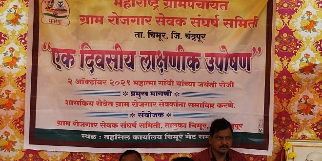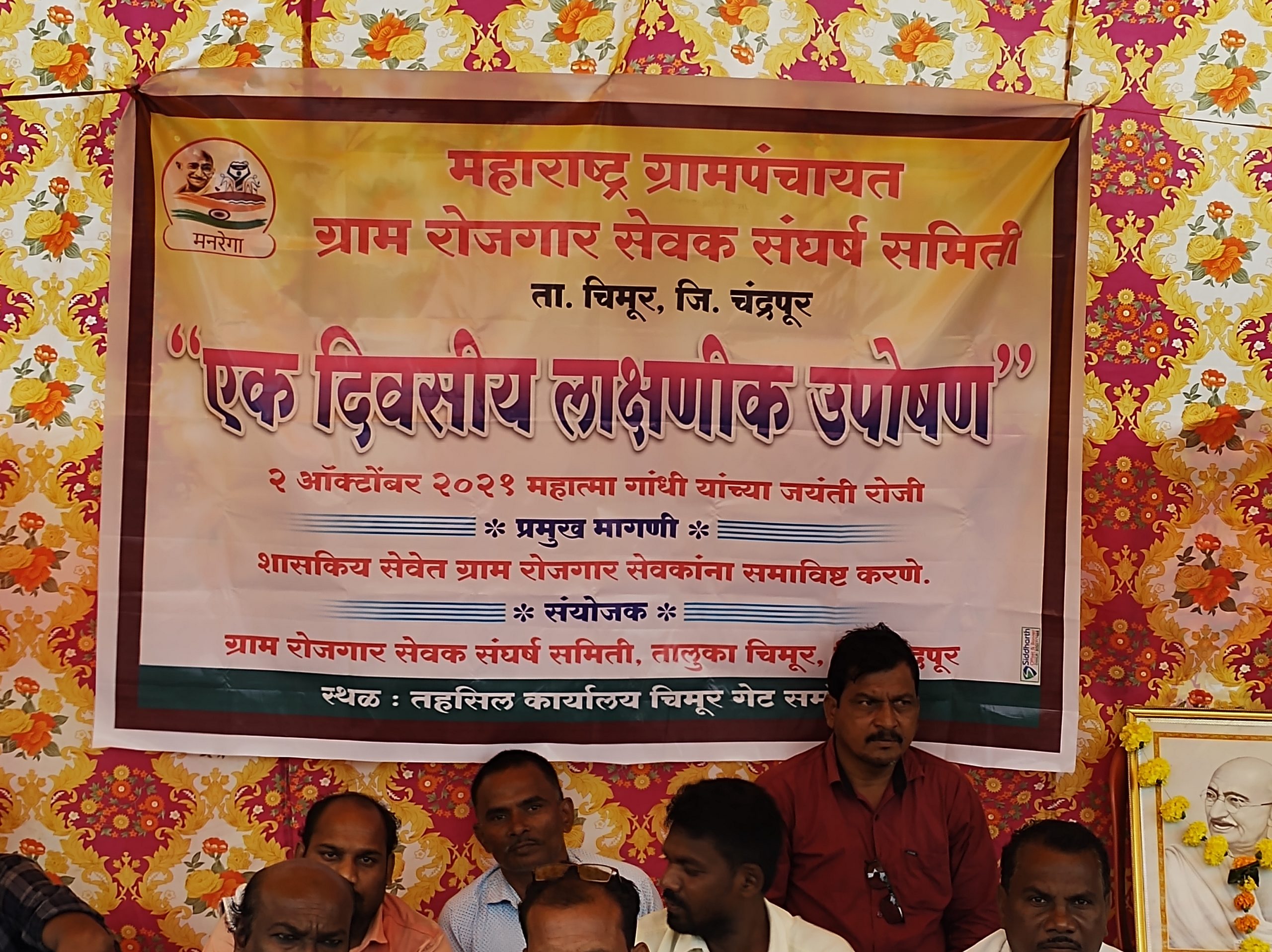 चिमूर: ग्रामरोजगार सेवक संघर्ष समितीचे वतीने चिमूर तहसील कार्यालयासमोर विविध मागण्या पूर्ण करण्यासाठी महात्मा गांधी जयंतीच्या दिवशी एकदिवसीय लाक्षणिक उपोषण पुकारले. राज्याचे मुख्यमंत्री यांना उपविभागीय अधिकारी मार्फत निवेदन देण्यात आले.