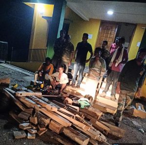 चिमूर :- चिमूर प्रादेशिक वनविभागा अंतर्गत खडसंगी उपवन क्षेत्रातील ब़ंदर (शिवापूर) गावात गुप्त माहीतीच्या आधारे रात्री 12 वाजताच्या दरम्यान अवैद्य सागवान तस्करांच्या घरी धाड टाकण्यात आली. यावेळी आरोपी सृजल मेश्राम राहणार बंदर (शिवापूर) अविनाश सती कोसरे (खडसंगी) सुरेश खडसान (खडसंगी) येथील रहिवासी असून यांच्या घरी अवैद्य सागवान असल्याचे वनविभाग यांना गुप्त माहिती मिळाली होती. त्यानुसार चिमूर चे वनपरिक्षेत्र अधिकारी व गस्त पथक वन विभाग यांनी वरील आरोपीचा घरी धाड टाकली असता अवैध सागवान, पाट्या, खाटेचे ठावे व काही सागवान चे ओंडके असा माल जप्त करण्यात आला.