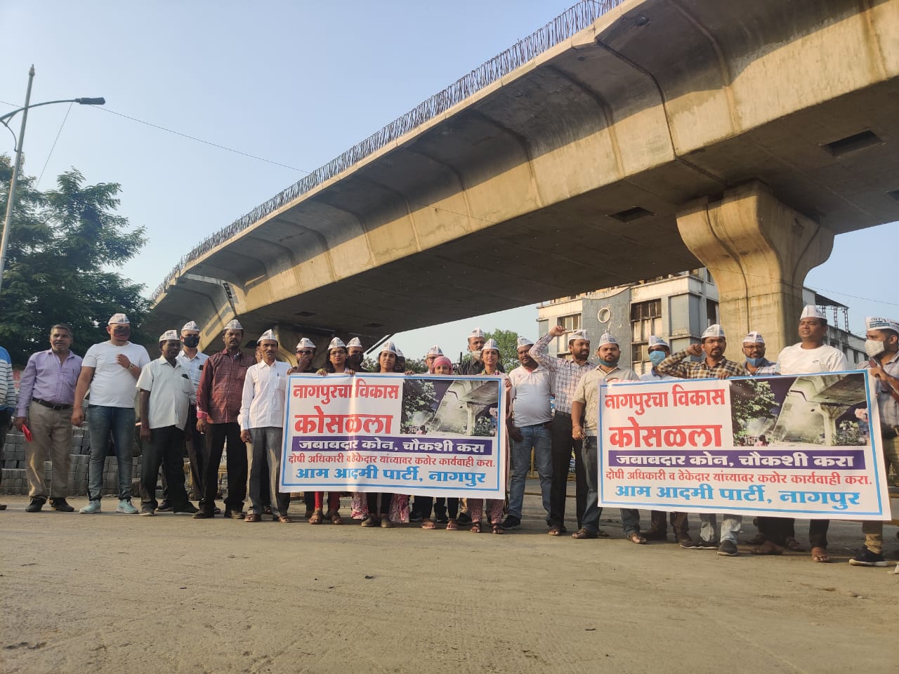 ह्या आंदोलनात प्रमुख्याने राज्य सहसचिव अशोक मिश्रा, राष्ट्रीय परिषद सदस्य अमरीश सावरकर, नागपूर सहसंयोजक डॉ जाफरी व राकेश उराडे, युवा राज्य समिती सदस्य कृतल वेलेकर आकरे, विदर्भ युवा संयोजक पीयुष आकरे, नागपूर युवा संयोजक गिरीश तितरमारे, उत्तर नागपूर संयोजक रोशन डोंगरे, विनोद खोडवे हे प्रामुख्याने उपस्थित होते. यावेळी अनियमितता करणाऱ्या अधिकारी व ठेकेदारवर त्वरित कार्यवाही करावी, तसेच बीजेपी विरोधात नारे बाजी करण्यात आली. आम्हाला कोसळणारा विकास नको, नागपुरकरांच्या कराचा पैसा व्यर्थ करू नका, गड़करी साहेब याची चौकशी करा, अशे नारे लावण्यता आलेत.
