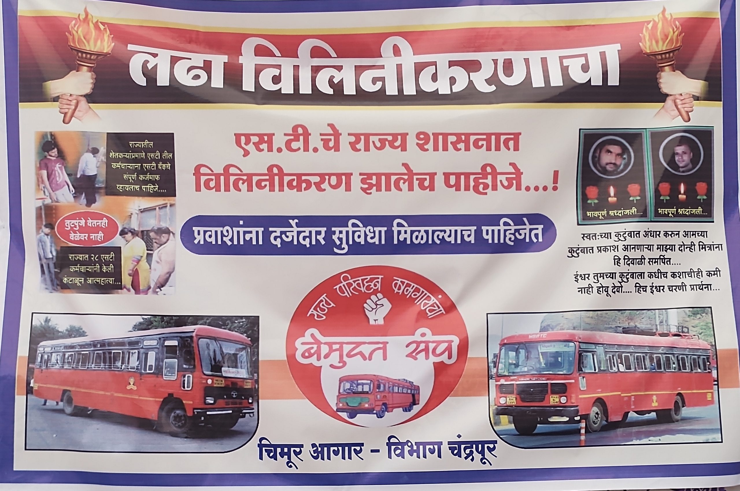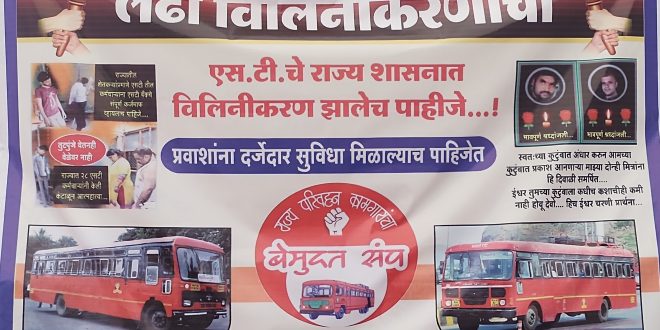 महाराष्ट्र राज्य परिवहनच्या सर्व संघटना कृति समितिने संपूर्ण महाराष्ट्रात राज्य परिवहन मंडळाचे राज्य शासनात विलीनिकरण करने व अन्य मागण्यासाठी उपोषण सुरु केले आहे,