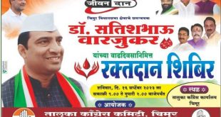 वाढदिवसाचे औचित्य साधून शहर काँग्रेस कमिटी तर्फे होणार रक्तदान शिबिर जिल्हा प्रतिनिधी-सुनिल हिंगणकर चिमूर : – दिनांक. १६ सप्टेंबर २०२३ रोजी डॉ.सतिश वारजुकर चिमूर – ७४ विधानसभा समन्वयक यांचे वाढदिवसाचे औचित्य साधून रक्तदान शिबिराचे आयोजन सकाळी ११ वाजताच्या सुमारास तालुका काँग्रेस कमिटी कार्यालय चिमूर येथे आयोजित करण्यात आले आहे. तसेच …