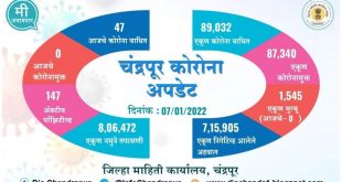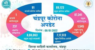 जिल्हा प्रतिनिधी-सुनिल हिंगणकर चंद्रपूर, दि. 8 जानेवारी : चालू आठवड्यात कोरोनाबाधितांच्या रुग्णसंख्येत लगातार वाढ होत असून जिल्ह्यात ॲक्टीव्ह रुग्णांची संख्या दोनशेच्या वर पोहचली आहे. गत 24 तासात जिल्ह्यात एकाने कोरोनावर मात केली असून त्या रुग्णाला रुग्णालयातून सुटी देण्यात आली. तसेच 91 नवीन रुग्ण बाधीत झाले आहे. जिल्ह्यात शनिवारी मृत्यू संख्या …